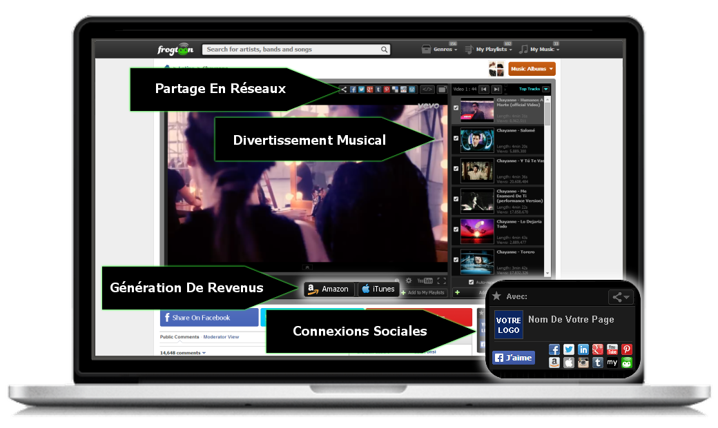 Frogtoon music donne accès aux utilisateurs à la plus grande bibliothèque de playlists de clips avec plus de 600 000 listings d'artistes et des millions de chansons provenant du monde entier. (Plus de 150 catégories de musique organisées par Genres et par pays)